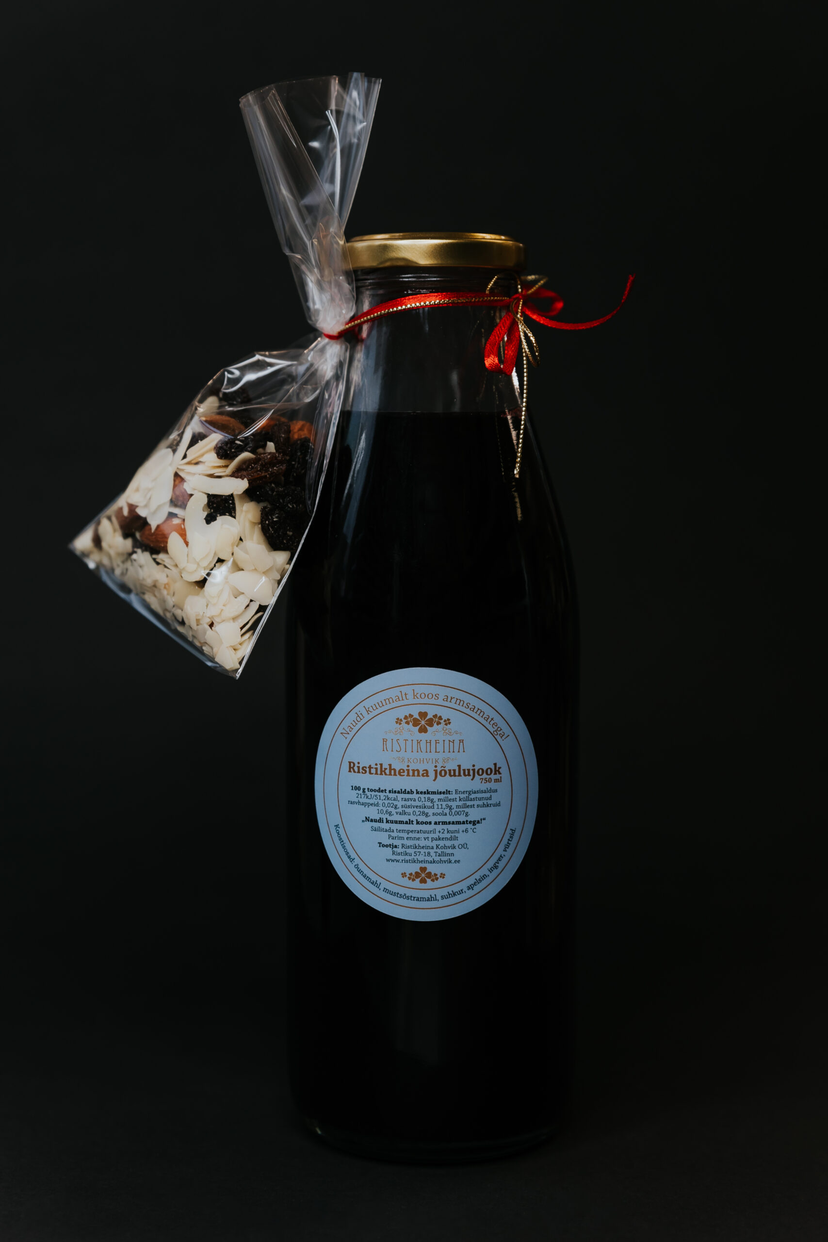 Koostisosad: õunamahl, mustsõstramahl, suhkur, apelsin, ingver, vürtsid, pähklikotike (mandel, rosin).